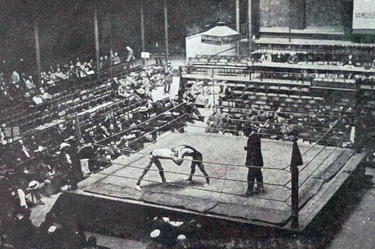 ‘Gisteren avond was de reusachtige feestzaal van onzen Dierentuin veel te klein om al de toeschouwers te bevatten die zich aan de winketten aanboden. Lang reeds waren de matchen bezig als nog honderden zich tevergeefs aan de poort verdrongen.’ – De Nieuwe Gazet